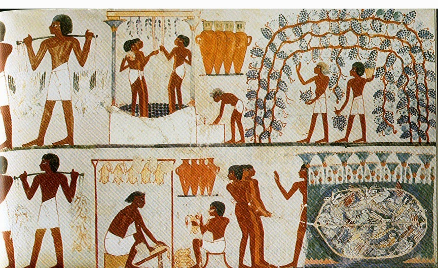 La primera evidencia arqueológica de machacado de las uvas con intención de extraer vino se puede observar en las representaciones del reinado de Udimu (ca. 3000 a. C.) En el Antiguo Egipto la cerveza era más popular que el vino. Las primeras variedades semi-silvestres de uva con las que se elaboraron vinos eran rojas y producían vino tinto, pero los egipcios tuvieron la posibilidad de hacer crecer una variedad mutada que permitía elaborar vinos blancos. Fermentaban el mosto en grandes vasijas de barro que estaban abiertas por la parte superior; tras su llenado las sellaban con una tapa del mismo material. Uno de los primeros vinos de los egipcios que se empleaba en las ceremonias religiosas se denominaba shedeh y se sabe que había dos formas de obtenerlo: del zumo de granadas o de uvas. Los Egipcios que vivían cerca de Delta celebraban cada año, en la luna nueva, el día de "ella regresa". Heródoto menciona que se bebía más vino en ese día que en el resto del año. Otro festival similar se celebraba en la luna llena.